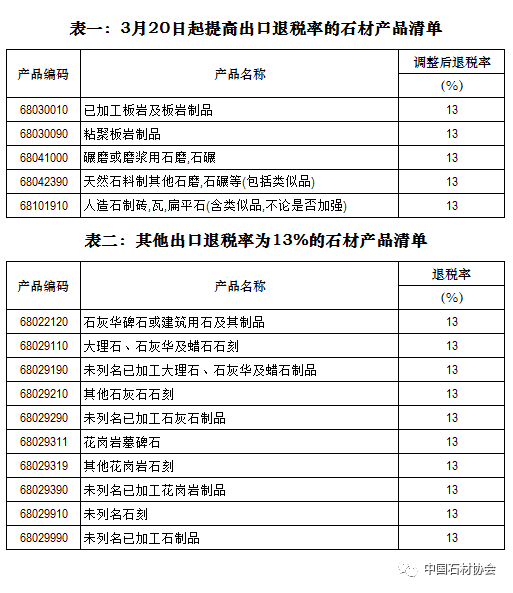 從石材行業(yè)來(lái)看,加上原有10個(gè)稅則號(hào)出口退稅率為13%的石材產(chǎn)品(表二),已有15個(gè)稅則號(hào)的石材產(chǎn)品出口退稅率提高13%。15個(gè)稅則號(hào)的石材產(chǎn)品2019年的出口量和出口額分別占到石材出口總量的76%和出口總值的88%。
