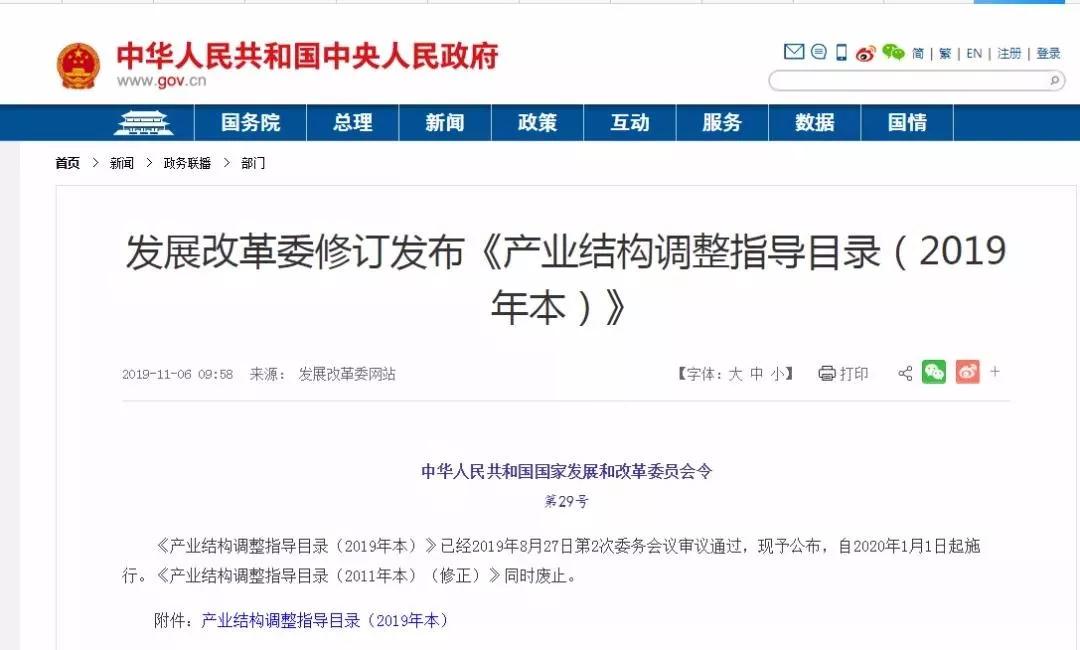 11月6日,發(fā)改委發(fā)布消息,《產(chǎn)業(yè)結(jié)構(gòu)調(diào)整指導(dǎo)目錄(2019年本)》于2019年8月27日第2次委務(wù)會(huì)議審議通過,自2020年1月1日起施行?!懂a(chǎn)業(yè)結(jié)構(gòu)調(diào)整指導(dǎo)目錄(2011年本)(修正)》同時(shí)廢止。