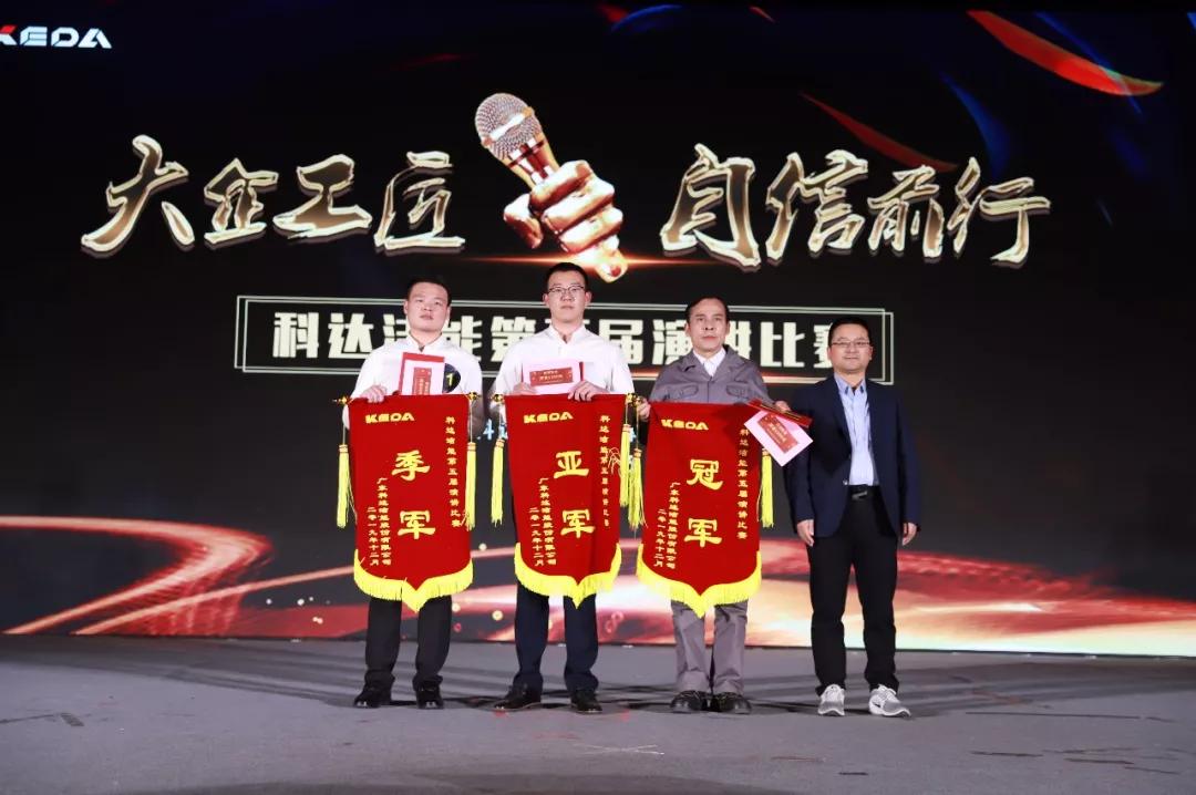 歷經(jīng)近兩個(gè)小時(shí)的比拼,老科達(dá)人、成型機(jī)械事業(yè)部“星火隊(duì)”的劉湘林榮獲冠軍,國際運(yùn)營中心、營銷中心聯(lián)隊(duì)“T.O.P隊(duì)”的盧揚(yáng)及石材公司“金石隊(duì)”的相永樂分獲亞軍及季軍。劉湘林同時(shí)摘得由現(xiàn)場(chǎng)觀眾投票選出的“最受歡迎演說家獎(jiǎng)”。