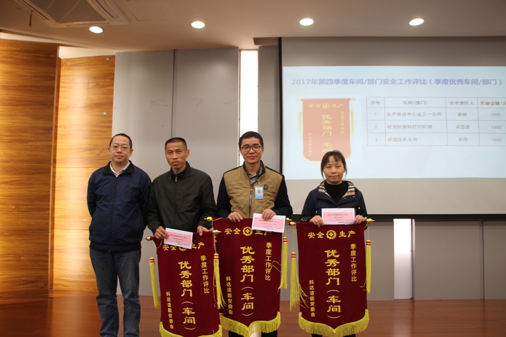 2017年第四季度安全生產(chǎn)優(yōu)秀部門(車間):生產(chǎn)供應(yīng)中心金工一車間、研發(fā)院數(shù)碼打印機(jī)械裝配車間、成型壓機(jī)車間(獎金:1000元/單位),生產(chǎn)供應(yīng)中心總經(jīng)理毛清為獲獎單位頒獎。