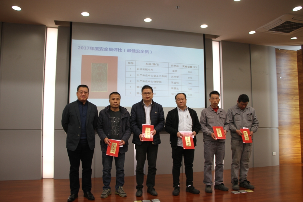 2017年度最佳安全部門(車間):石材裝配車間、成型壓機(jī)車間、生產(chǎn)供應(yīng)中心物資管理部、陶瓷科技工程部、陶瓷科技生產(chǎn)部(獎金:2000元/單位),陶瓷科技公司總經(jīng)理王德良為獲獎單位頒獎。