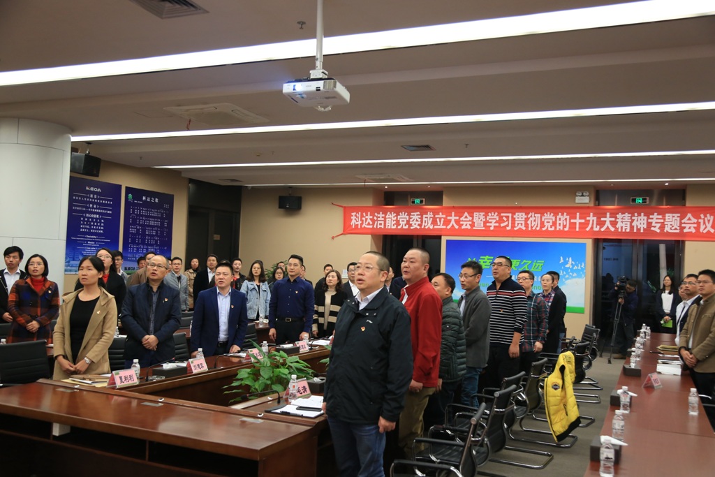 12月11日下午,伴隨著激昂奮進(jìn)的《國(guó)歌》,科達(dá)潔能黨委成立大會(huì)暨學(xué)習(xí)貫徹黨的十九大精神專題會(huì)議在公司總部會(huì)議中心召開(kāi)。佛山市委黨校經(jīng)濟(jì)學(xué)教研部主任副教授湯虹玲,陳村鎮(zhèn)黨委委員、鎮(zhèn)“兩新”黨工委副書(shū)記廖海標(biāo),科達(dá)潔能董事長(zhǎng)邊程,副總裁鐘應(yīng)洲、周鵬,科達(dá)潔能黨委書(shū)記李斌以及公司核心經(jīng)營(yíng)管理團(tuán)隊(duì)和全體黨員同志出席了會(huì)議??七_(dá)潔能人力資源總監(jiān)兼黨委副書(shū)記蘇順兵主持會(huì)議。陳村鎮(zhèn)黨委委員、鎮(zhèn)“兩新”黨工委副書(shū)記廖海標(biāo)宣讀了《中共陳村鎮(zhèn)“兩新”組織工作委員會(huì)關(guān)于中共廣東科達(dá)潔能股份有限公司黨總支部委員會(huì)調(diào)整組織設(shè)置的批復(fù)》文件。
