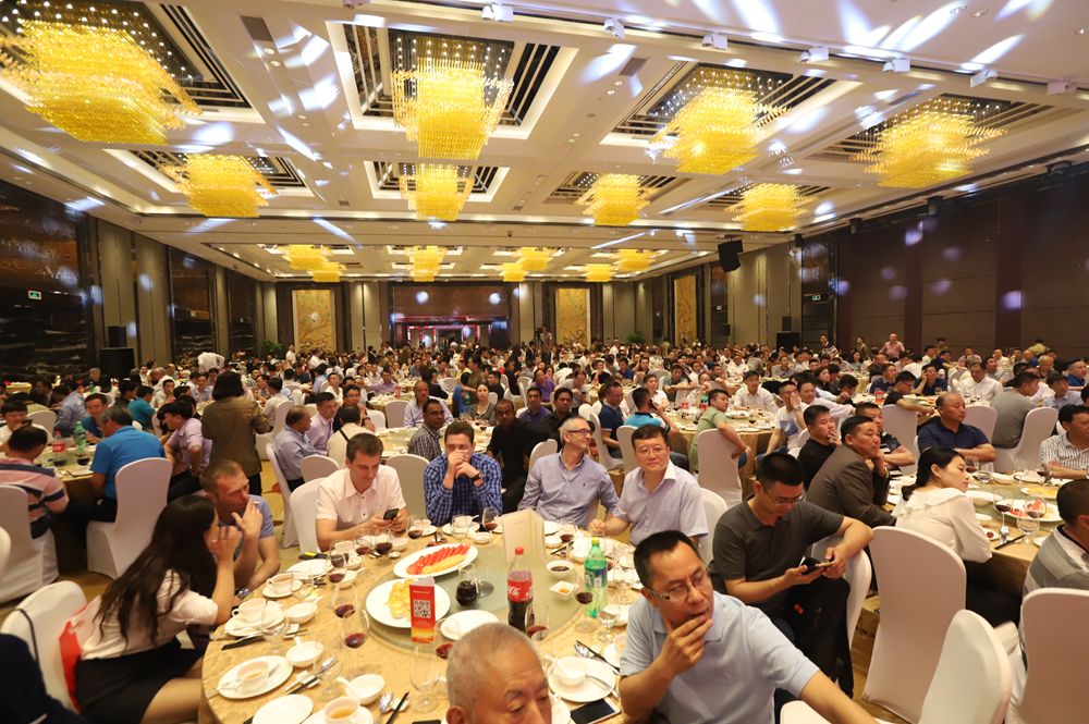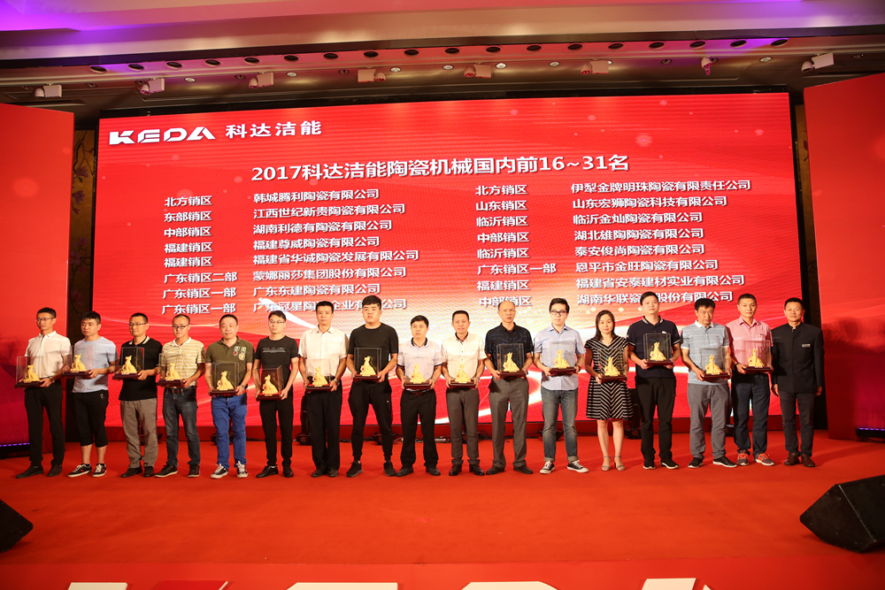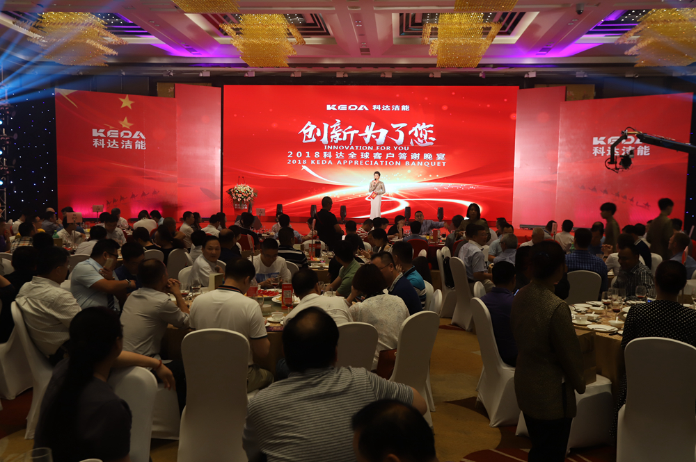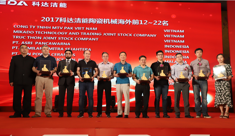 晚宴由公司營銷總監(jiān)鐘琳和國際營銷總監(jiān)劉曉東中英雙語聯(lián)袂主持,為表達(dá)對國內(nèi)外客戶的支持,科達(dá)向國內(nèi)前31名和國外前23名大客戶頒發(fā)了精美的“金犬旺財(cái)”紀(jì)念品。公司董事長邊程、總裁吳木海攜經(jīng)營班子向海內(nèi)外客戶敬酒致謝,吳總表示,近幾年來科達(dá)不斷加大研發(fā)投入,正如大家在展會(huì)上所看到的從自動(dòng)配料連續(xù)球磨機(jī)到EXTENLLER1600成型系統(tǒng)再到窯爐、自動(dòng)磨邊線和自動(dòng)包裝線一系列產(chǎn)品,科達(dá)投入了大量的人力物力財(cái)力推動(dòng)行業(yè)從自動(dòng)化走向智能化?!坝心銈兊闹С郑蚁嘈趴七_(dá)的明天會(huì)更好,陶瓷行業(yè)的明天會(huì)更好!”