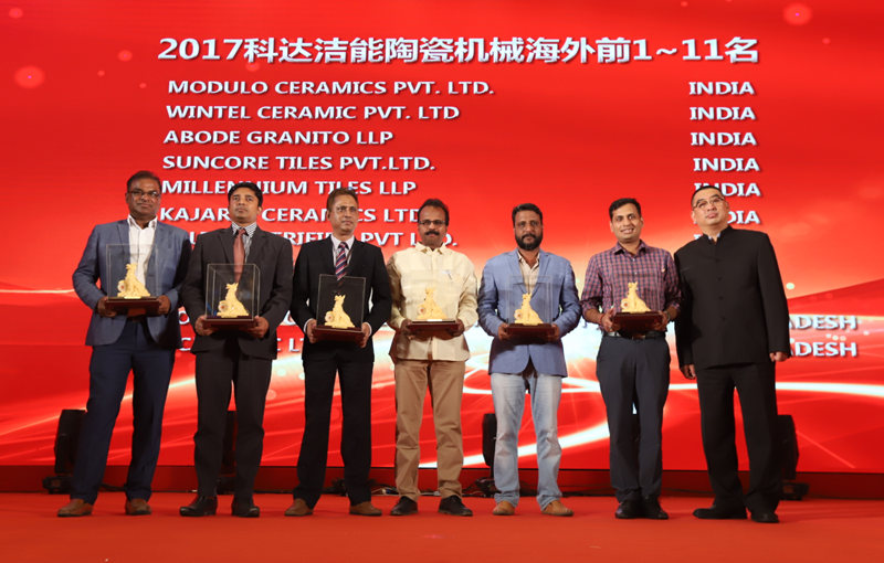 當(dāng)天的晚宴現(xiàn)場特別邀請到了印度陽光陶瓷集團(tuán)總經(jīng)理Mr. Jagdish,他們購買了科達(dá)第一臺KD16008壓機(jī),他做了簡短但充滿激情的發(fā)言。他談到,SUNHEARRT陶瓷擁有二十多年的歷史,從最小的瓷磚開始,目前能生產(chǎn)1200×2400mm的大板,公司的瓷磚日產(chǎn)量5萬平方米,產(chǎn)品出口到50多個(gè)國家和地區(qū),是印度最大的瓷磚出口公司,兩年前計(jì)劃做超大規(guī)格的瓷磚,考察了意大利的設(shè)備公司之后,發(fā)現(xiàn)他們的設(shè)備價(jià)格非常高,投入巨大會(huì)使他們很難在市場上生存下來,從意大利回來以后他訪問了科達(dá)公司,經(jīng)過商談以后確定使用科達(dá)第一臺KD16008壓機(jī),科達(dá)給了我們極大的支持,我們從2003年開始與科達(dá)合作,很榮幸能跟科達(dá)做了這么長久的生意,也希望大家都能夠堅(jiān)定的支持科達(dá)。