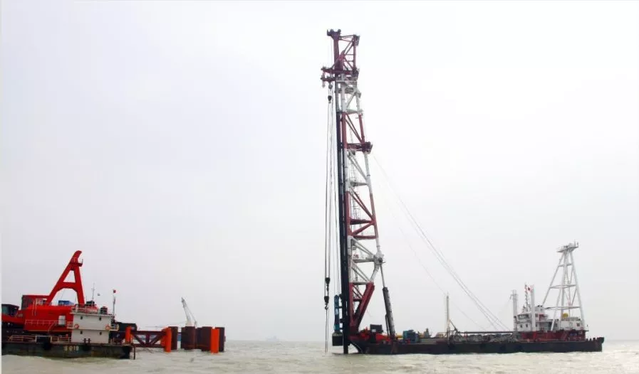 支撐整個(gè)大橋的巨型鋼樁數(shù)以萬(wàn)根,在海上打樁比在陸地上難得多,特別是主跨風(fēng)帆橋的鋼樁施工尤其困難和重要。此處鋼樁直徑2.5米,重達(dá)120噸,每根長(zhǎng)度67米,超過(guò)20層樓高,單根作業(yè)不能超1個(gè)小時(shí),因?yàn)檫@里是中華白海豚棲息洄游主通道,施工對(duì)震動(dòng)、噪音和污染有嚴(yán)格要求。