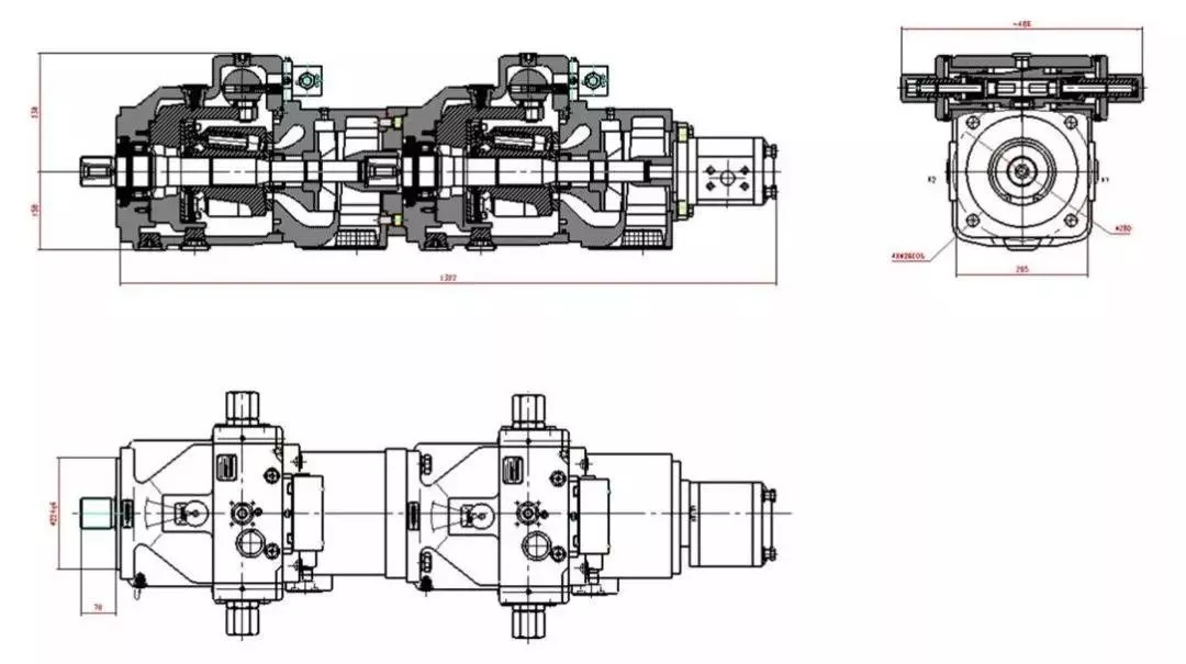 科達(dá)液壓拿下項(xiàng)目,楊總立即召集技術(shù)、工藝和生產(chǎn)等部門(mén)負(fù)責(zé)人,連續(xù)多個(gè)白天黑夜商討技術(shù)方案,最終決定在原有科達(dá)成熟產(chǎn)品KD-A4VSO355LR2的基礎(chǔ)上創(chuàng)新性提出:在高可靠科達(dá)重載泵吸油腔內(nèi)置渦輪增壓,實(shí)現(xiàn)高轉(zhuǎn)速;將單泵串聯(lián)2組再加125齒輪泵,達(dá)到額定排量835ml/r,確保高轉(zhuǎn)速下大排量高壓運(yùn)行。