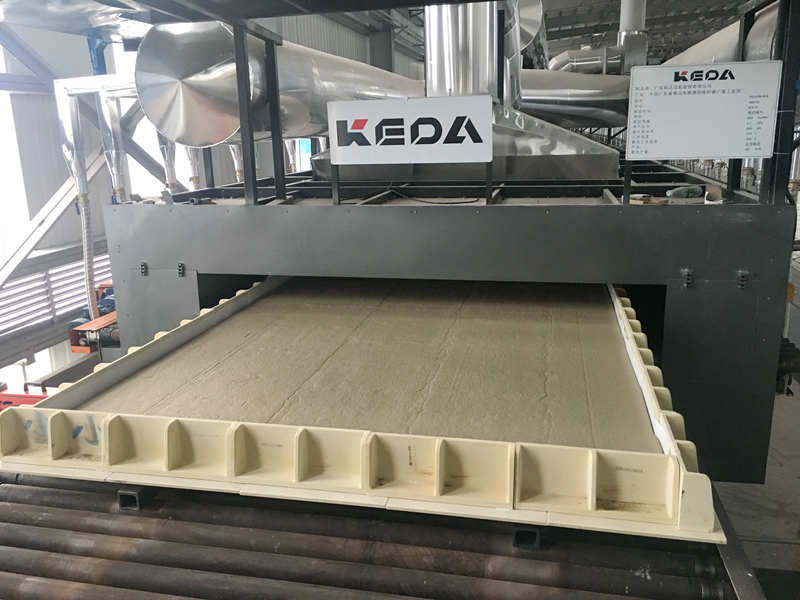 發(fā)泡陶瓷燒成工序采用科達自主研制的高效節(jié)能發(fā)泡陶瓷輥道窯,窯長390.96m、窯內(nèi)寬2.4m??七_的高效節(jié)能發(fā)泡陶瓷輥道窯采用特殊的燃燒系統(tǒng),針對發(fā)泡陶瓷產(chǎn)品的特性,采用專用分段比例,大幅縮減產(chǎn)品生產(chǎn)周期,已把生產(chǎn)周期縮短到10h,大大降低單位產(chǎn)品能耗。該窯窯內(nèi)溫度控制精準,溫差小,熱利用率高,整體冷卻效果好、速度快,氣孔均勻。與此同時,產(chǎn)品燒成后平整度高,后續(xù)切割量少,大大提高產(chǎn)品收成率,減少生產(chǎn)成本。