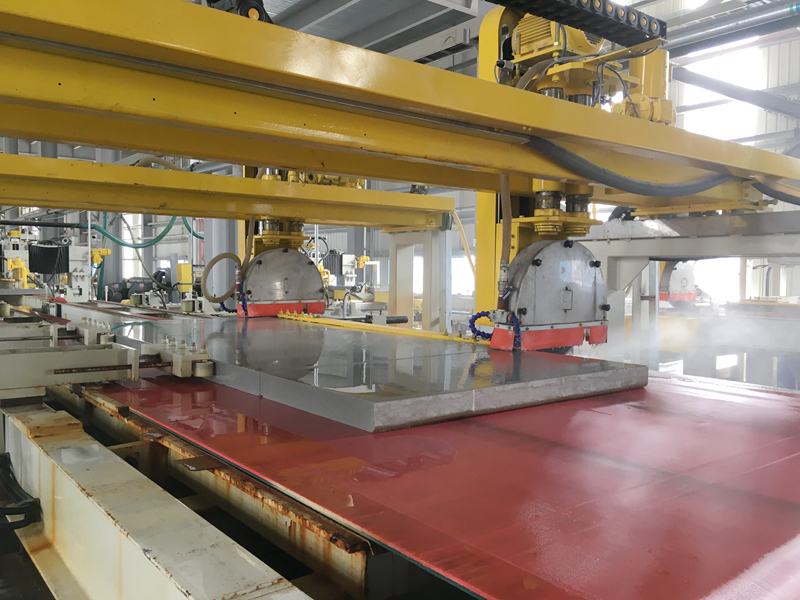 福建德勝項目生產(chǎn)的發(fā)泡陶瓷產(chǎn)品規(guī)格為1800×3000×80mm(成品),燒成周期為10h。該項目采用當(dāng)?shù)靥赜械牧_源紅花崗巖尾礦為原料進行生產(chǎn)。由于花崗巖尾礦屬于生料,不同于以往采用拋光廢渣作為原料的生產(chǎn)工藝,在配方工藝上更復(fù)雜、窯爐的溫度曲線調(diào)節(jié)難度更高。該自動化整線應(yīng)用了系統(tǒng)進一步升級的輥道窯自動化裝卸載系統(tǒng),整板系統(tǒng)、布料系統(tǒng)的自動化程度更高、性能更加穩(wěn)定可靠,實現(xiàn)精準布料的同時,確保產(chǎn)品的厚度均勻性,提高產(chǎn)品成品率。