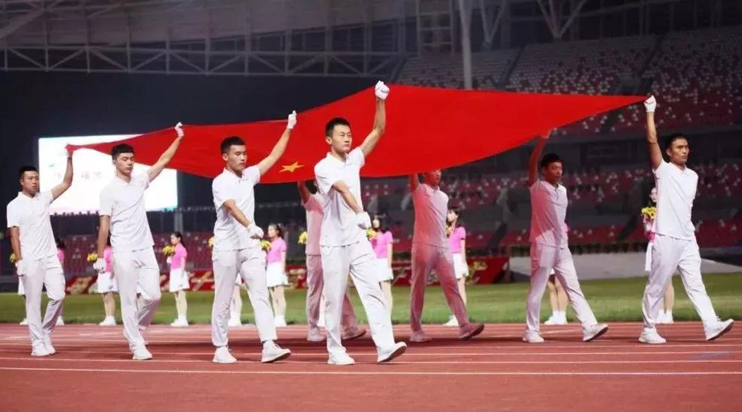 當晚19時45分,歡快的樂聲響起,開幕式暖場表演正式開始。身著大紅色的喜慶服裝,由近百人組成的馬鞍山非遺表演《打蓮湘》隊伍一下就帶動了全場的氣氛。暖場表演結(jié)束后,伴隨著《歌唱祖國》、《擁抱新時代》的背景音樂,鮮艷的五星紅旗和十二運會會旗率先入場。緊隨其后的,是朝氣蓬勃的紅旗方隊,120名青年手持紅旗,大步流星、氣宇軒昂。100名萌寶組成的滑步車方隊活力滿滿,向未來出發(fā),向希望前行。