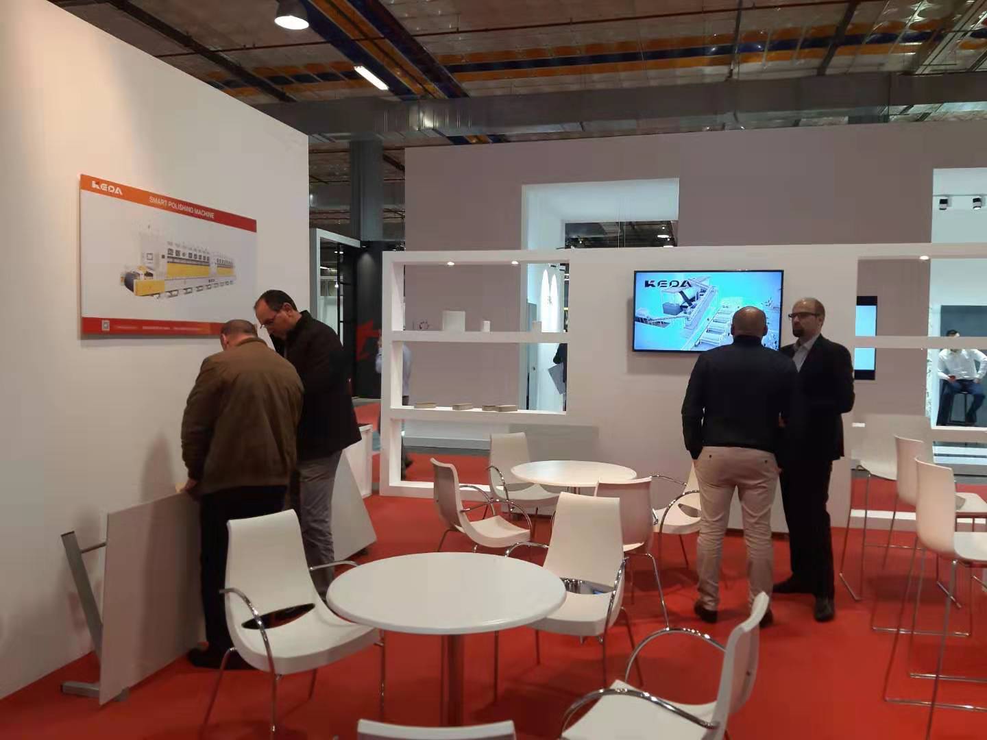 本屆展會上,有60%的參展商為瓷磚品牌,設(shè)備供應(yīng)商占比近10%??七_(dá)展位在設(shè)備商集中的7號展館,科達(dá)展位以白色和紅色為主要色彩搭配,突出“中國紅”的設(shè)計元素。并以產(chǎn)品畫冊和海報的形式展示了科達(dá)的智能拋磨整線和大噸位壓機;通過視頻展示了科達(dá)在全球各地的整線項目,以及發(fā)泡陶瓷、透水磚生產(chǎn)工藝流程。同時,現(xiàn)場展出了發(fā)泡陶瓷和透水磚產(chǎn)品、超潔亮瓷磚樣品,超耐磨干法磨邊輪以及250和355排量的科達(dá)液壓泵。