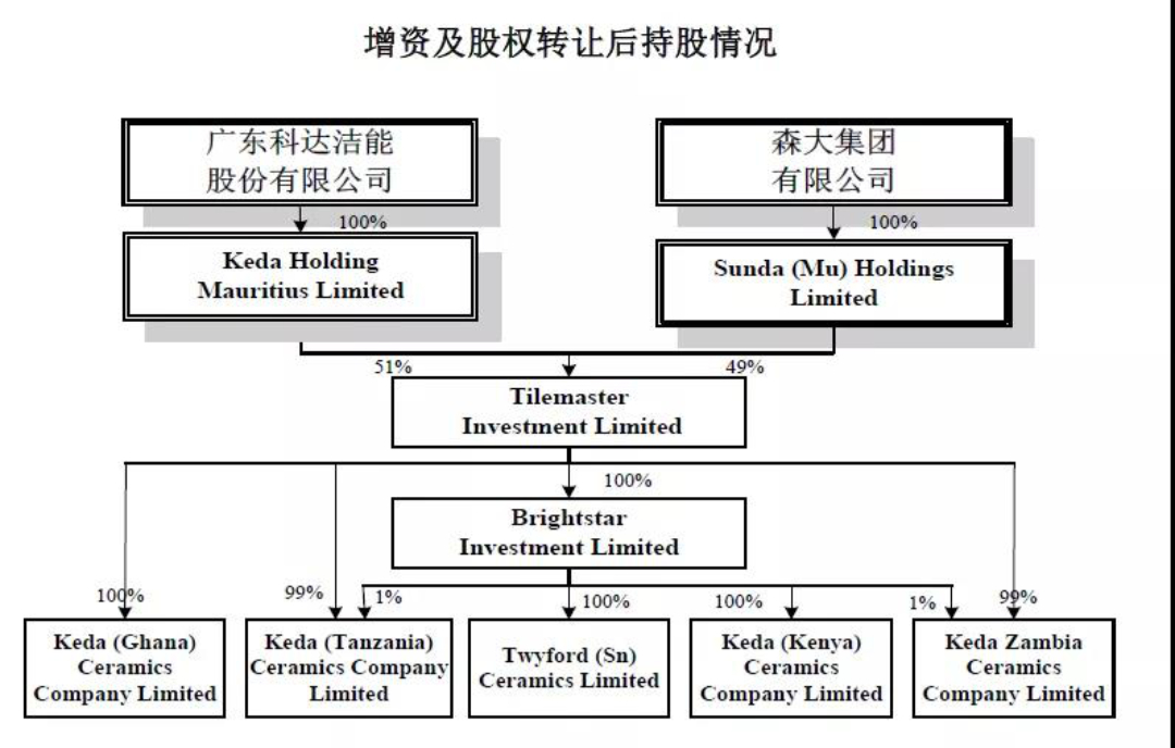 公告還指出,為優(yōu)化集團(tuán)管理體系,科達(dá)潔能及森大集團(tuán)擬調(diào)整非洲合資公司的股權(quán)架構(gòu),以分別持有的非洲合資公司股權(quán)及債權(quán),對新設(shè)合資公司 Tilemaster 進(jìn)行增資及相關(guān)股權(quán)轉(zhuǎn)讓。本次股權(quán)變更完成后,科達(dá)潔能及森大集團(tuán)對非洲合資公司持有的股權(quán)比例保持不變,其中,科達(dá)潔能通過全資子公司 Keda Holding 持有Tilemaster 51%股權(quán),從而間接持有各合資公司 51%股權(quán)。