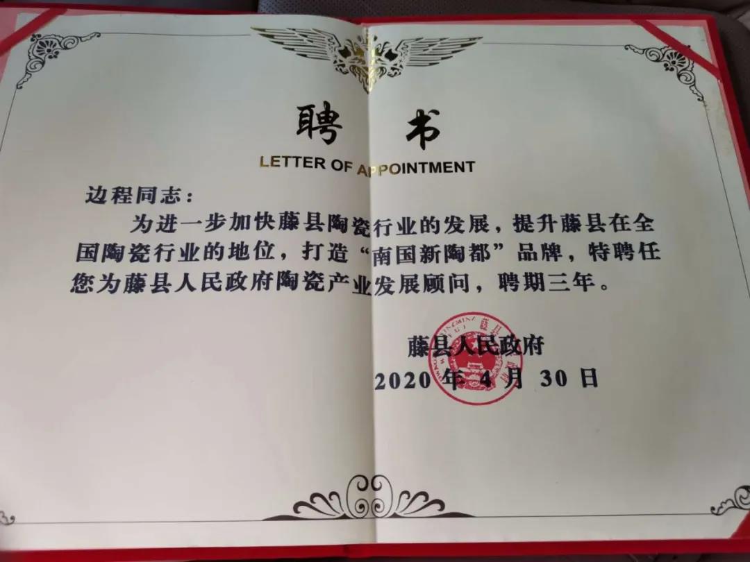 藤縣人民政府特別聘請邊董擔任“藤縣人民政府陶瓷產(chǎn)業(yè)發(fā)展顧問”,在廣西歐神諾工廠舉行了聘任儀式,藤縣縣長覃仕平向邊董頒發(fā)“聘任證書”。