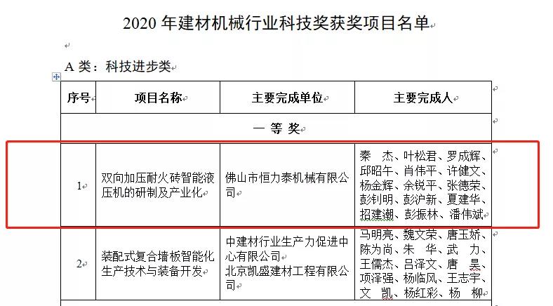 近日,中國建材機(jī)械工業(yè)協(xié)會(huì)公布了2020年建材機(jī)械行業(yè)科技獎(jiǎng)獲獎(jiǎng)項(xiàng)目名單。恒力泰公司的“雙向加壓耐火磚智能液壓機(jī)的研制及產(chǎn)業(yè)化”項(xiàng)目榮獲建材機(jī)械行業(yè)科技進(jìn)步類一等獎(jiǎng),安徽科達(dá)機(jī)電公司的“蒸壓加氣混凝土板材鞍架網(wǎng)籠自動(dòng)循環(huán)處理系統(tǒng)”項(xiàng)目榮獲科技進(jìn)步類二等獎(jiǎng)。