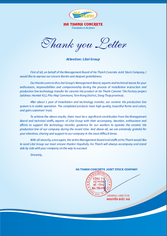 客戶在感謝信中說道:"力泰團(tuán)隊(duì)是熱情友好的團(tuán)隊(duì),負(fù)責(zé)任有擔(dān)當(dāng)。非常感謝力泰團(tuán)隊(duì)在河清公司最困難時(shí)期給予的各項(xiàng)幫助與支持。現(xiàn)在生產(chǎn)線整體穩(wěn)定、產(chǎn)品質(zhì)量上乘、造型與色質(zhì)美觀,深受客戶好評(píng)。河清全體職員再次衷心地向力泰團(tuán)隊(duì)表示最誠摯的謝意,希望雙方攜手并肩走在成功的大道上。"