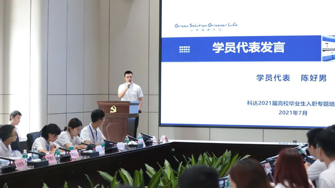 學(xué)員代表陳好男代表全體學(xué)員發(fā)言,他表示,2021屆高校畢業(yè)生告別學(xué)習(xí)生涯,從五湖四海匯聚于此,開啟新的人生旅程。作為一名科達(dá)新人,他們堅(jiān)信,只要從思想上武裝自己,從本領(lǐng)上提升自己,準(zhǔn)備就緒,就能在科達(dá)找到屬于自己的發(fā)揮舞臺(tái),完成自己人生道路上最重要的蛻變,進(jìn)而向公司交出一份滿意的答卷!