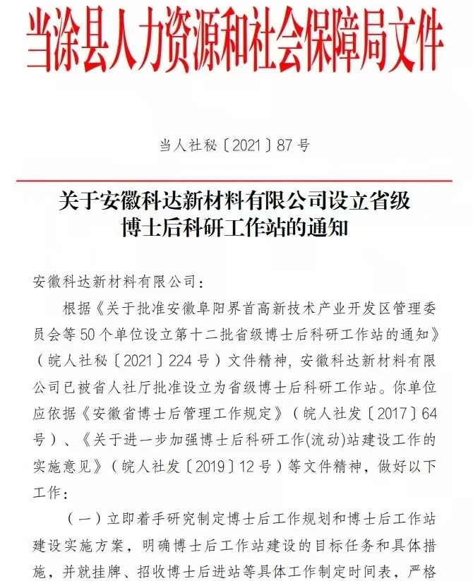 近日,安徽科達(dá)新材料有限公司獲批設(shè)立博士后科研工作站。