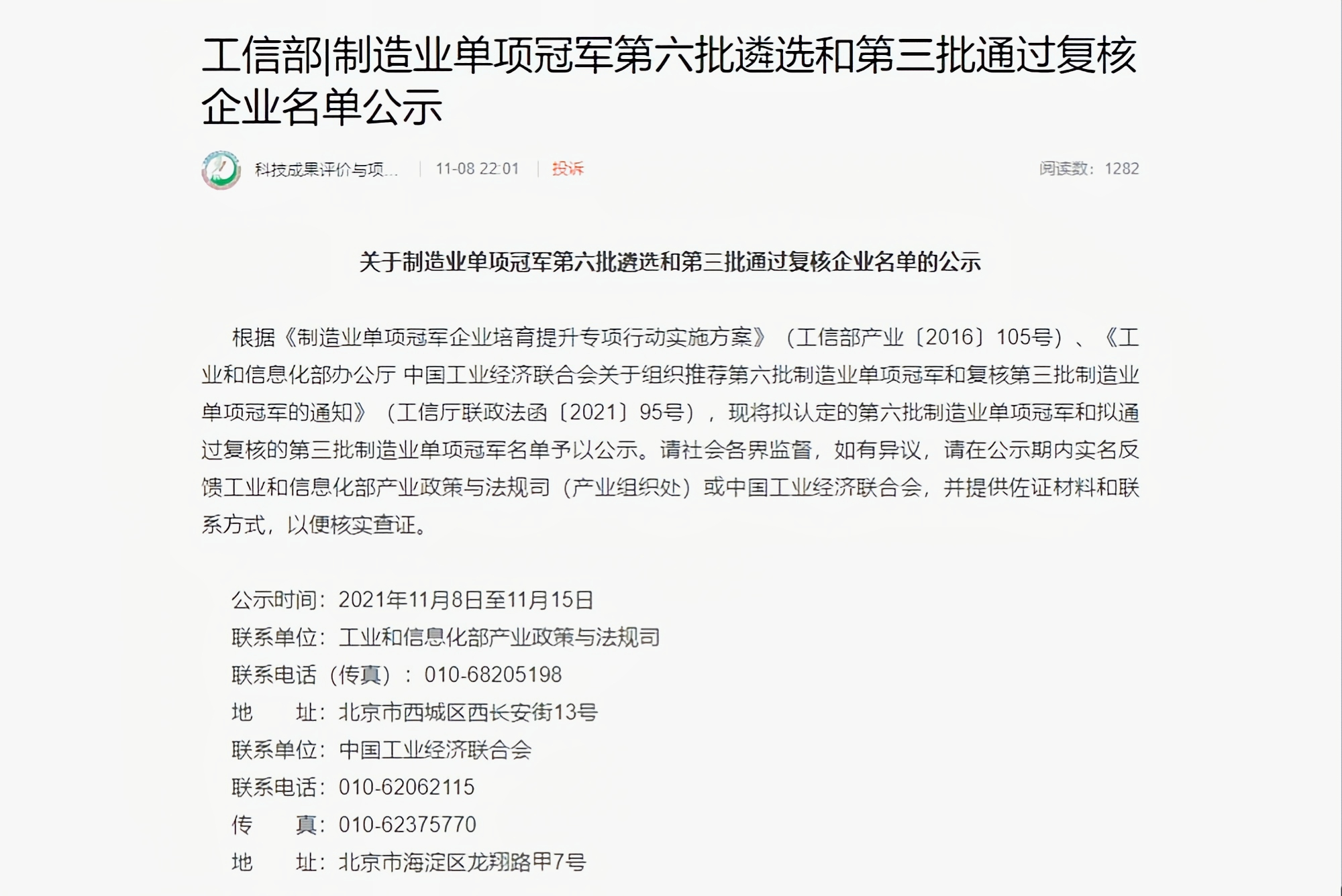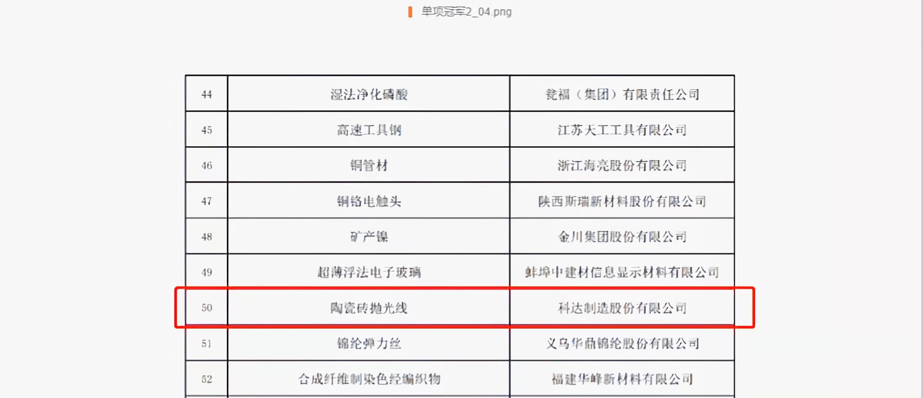 2021年11月8日-15日,國(guó)家工業(yè)和信息化部公示了第三批制造業(yè)單項(xiàng)冠軍名單,其中,科達(dá)制造股份有限公司的“陶瓷磚拋光線”榮獲“單項(xiàng)冠軍產(chǎn)品”稱號(hào)。