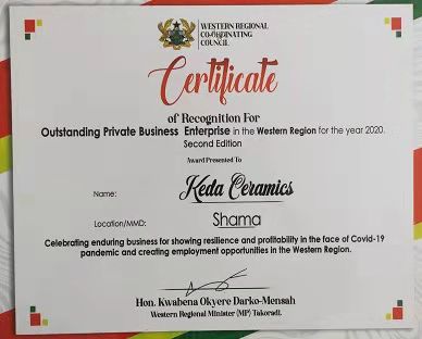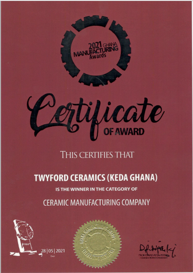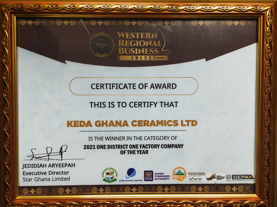 除此之外,科達(加納)陶瓷于2021年5月28日再次獲得“加納制造獎”,并且還在近日被西部省政府授予 2020年“優(yōu)秀民營企業(yè)”稱號,以表彰企業(yè)在促進就業(yè)等方面做出的貢獻以及在新冠疫情期間展現(xiàn)出的韌勁與堅毅。