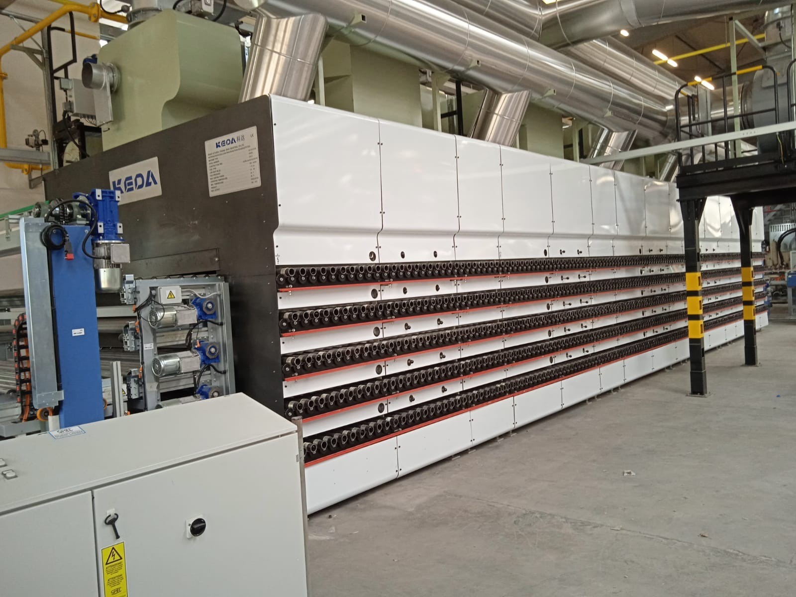 科達(dá)“MIH系列多層內(nèi)循環(huán)節(jié)能干燥器” 減少了設(shè)備占地面積,采用高效雙出口循環(huán)風(fēng)機(jī)加強(qiáng)熱風(fēng)循環(huán),提高對(duì)流換熱速度及干燥效率;利用獨(dú)立箱體單元循環(huán)結(jié)構(gòu)以及控制參與循環(huán)的進(jìn)風(fēng)和廢氣風(fēng)量,減少干燥器內(nèi)溫差,可有效調(diào)整干燥器前后段溫度;降低能耗,提高坯體干燥質(zhì)量。