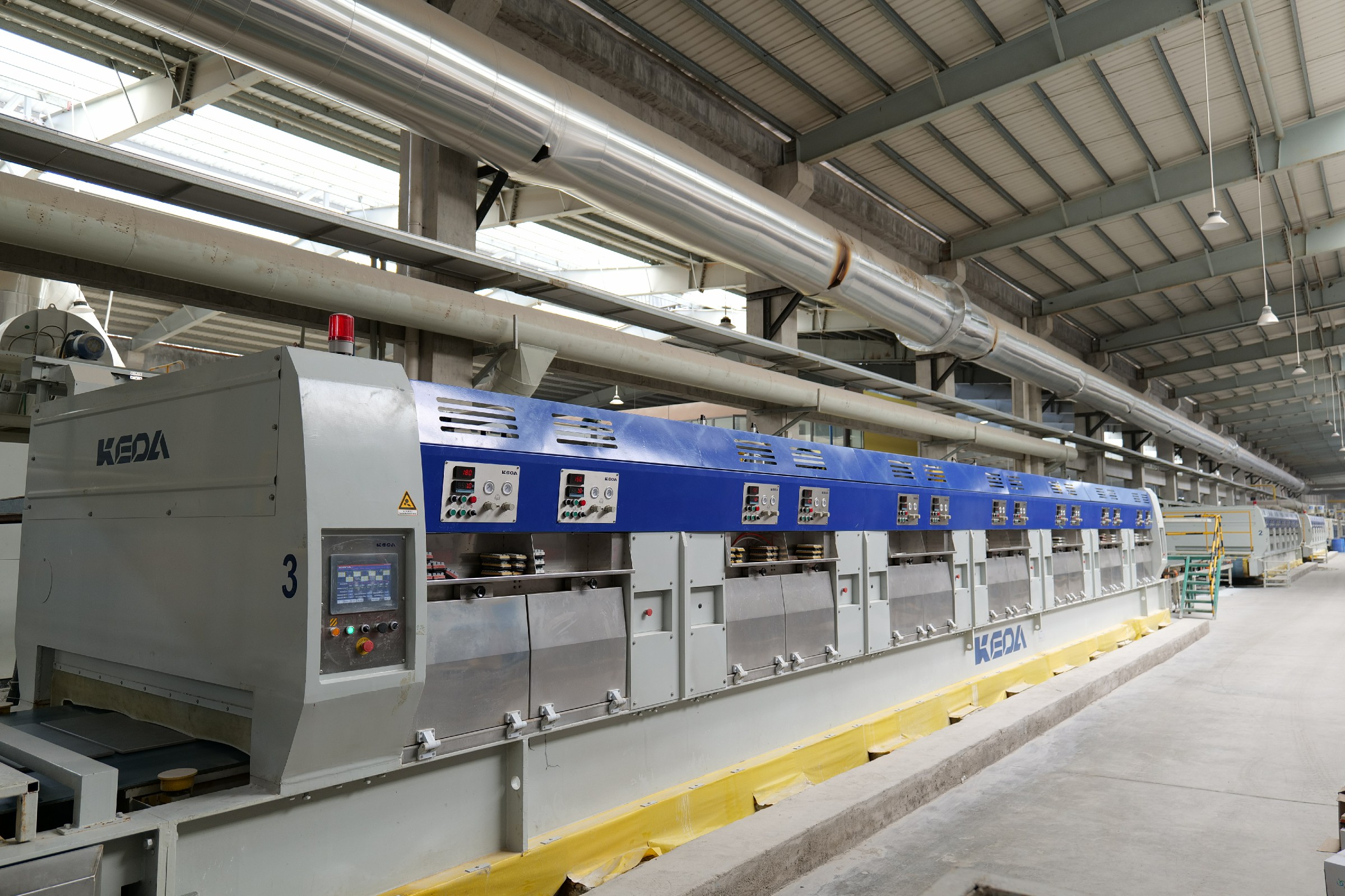 2016年,科達(dá)推出行業(yè)首條數(shù)控智能磨邊線(xiàn),應(yīng)用于廣東家美,將拋磨設(shè)備帶入了數(shù)控智能時(shí)代;5年后,科達(dá)再次引領(lǐng)行業(yè)發(fā)展,創(chuàng)新推出多段智能擺動(dòng)高效拋光機(jī),并在江西唯美陶瓷有限公司(以下簡(jiǎn)稱(chēng)“江西唯美”)兩條巖板拋光整線(xiàn)順利投產(chǎn),為陶瓷企業(yè)解決拋光不均、漏拋、黃邊質(zhì)量問(wèn)題,同時(shí)大幅提升拋光效率,為節(jié)能降耗提出“科達(dá)方案”。