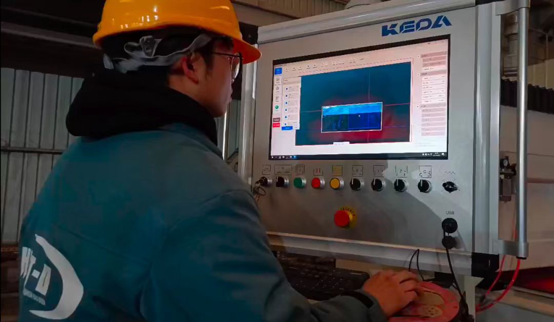 科達智能切割調(diào)度生產(chǎn)線最大可加工1600×3600(mm)規(guī)格的板材,上板之后,科達自主研制的KEDAScan系列掃描儀通過高精度工業(yè)相機對板材進行自動掃描,并自動打印貼標簽,每一款巖板和每一塊石材都有對應的ID號,相當于身份證號,將板材數(shù)字化,里面集成了紋理、色彩、尺寸及項目名稱等信息。