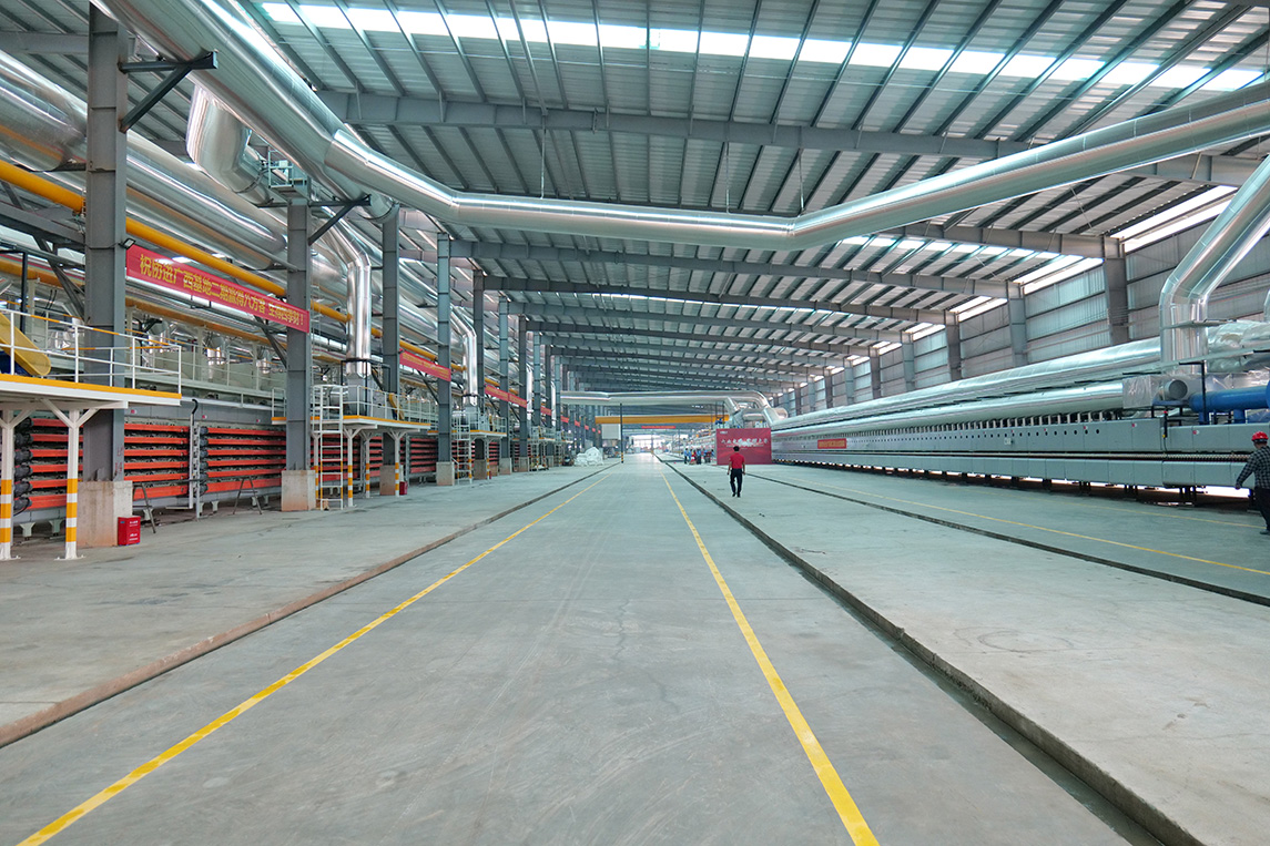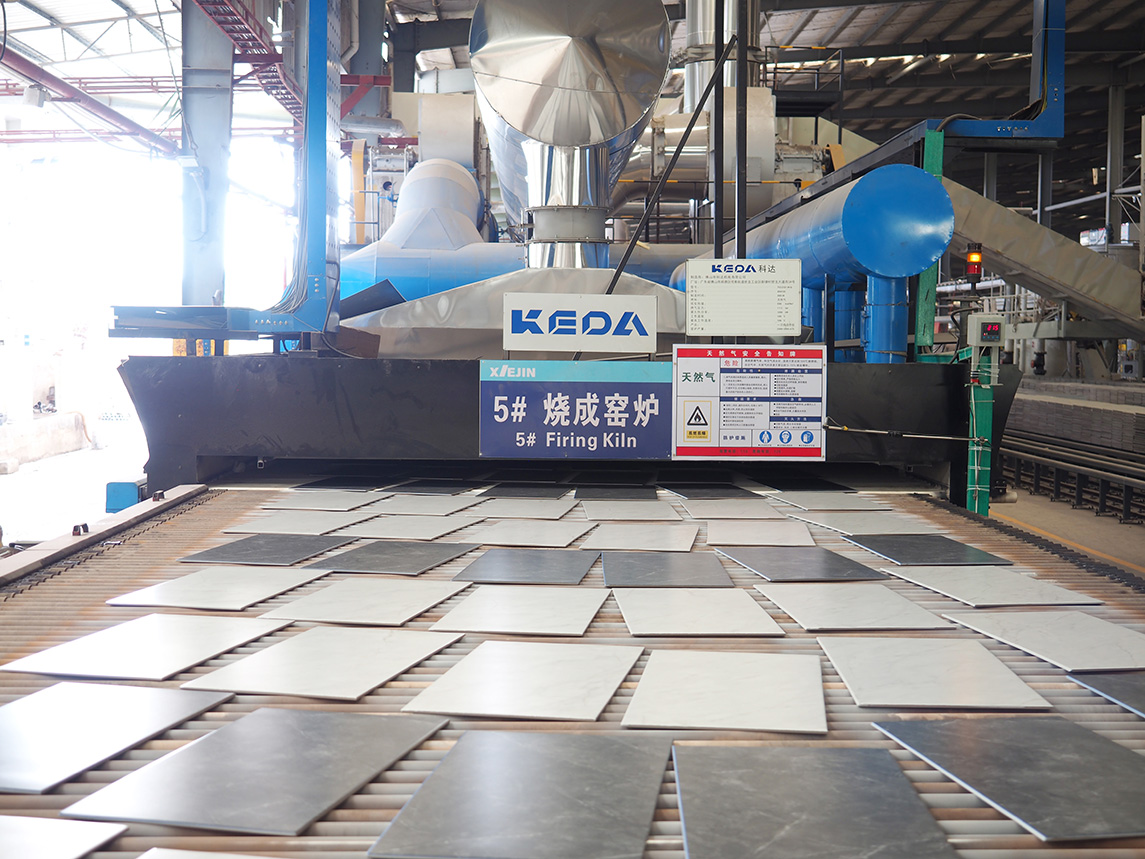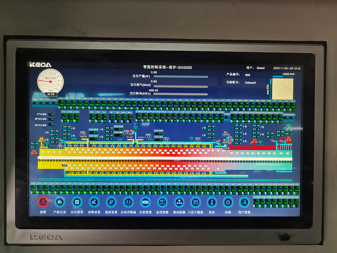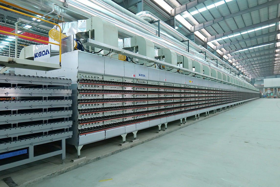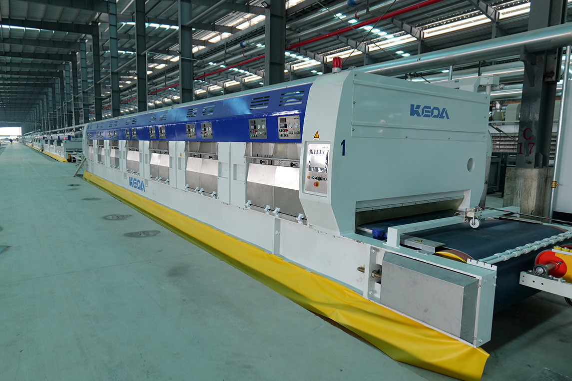 燒成設(shè)備為科達(dá)按高標(biāo)準(zhǔn)定制的高效節(jié)能寬體輥道窯,應(yīng)用了助燃風(fēng)加熱系統(tǒng)、助燃分組精準(zhǔn)控制系統(tǒng)、窯體綜合保溫升級系統(tǒng)、高效節(jié)能窯爐噴槍,以及V3.0窯爐智能控制系統(tǒng),為該線在產(chǎn)質(zhì)量、能耗及智能化等方面樹立領(lǐng)先優(yōu)勢提供充足保障。主要生產(chǎn)規(guī)格為400×800mm、800×800mm、 600×1200mm、750×1500mm等規(guī)格拋釉及中板產(chǎn)品,中板產(chǎn)品設(shè)計(jì)產(chǎn)能50000㎡/天。