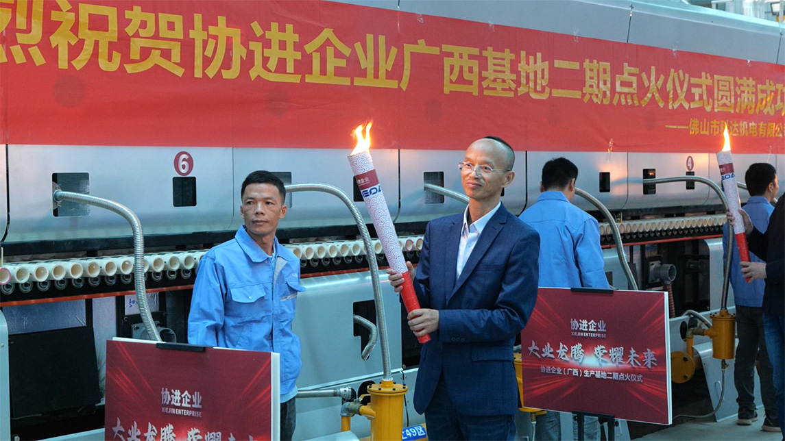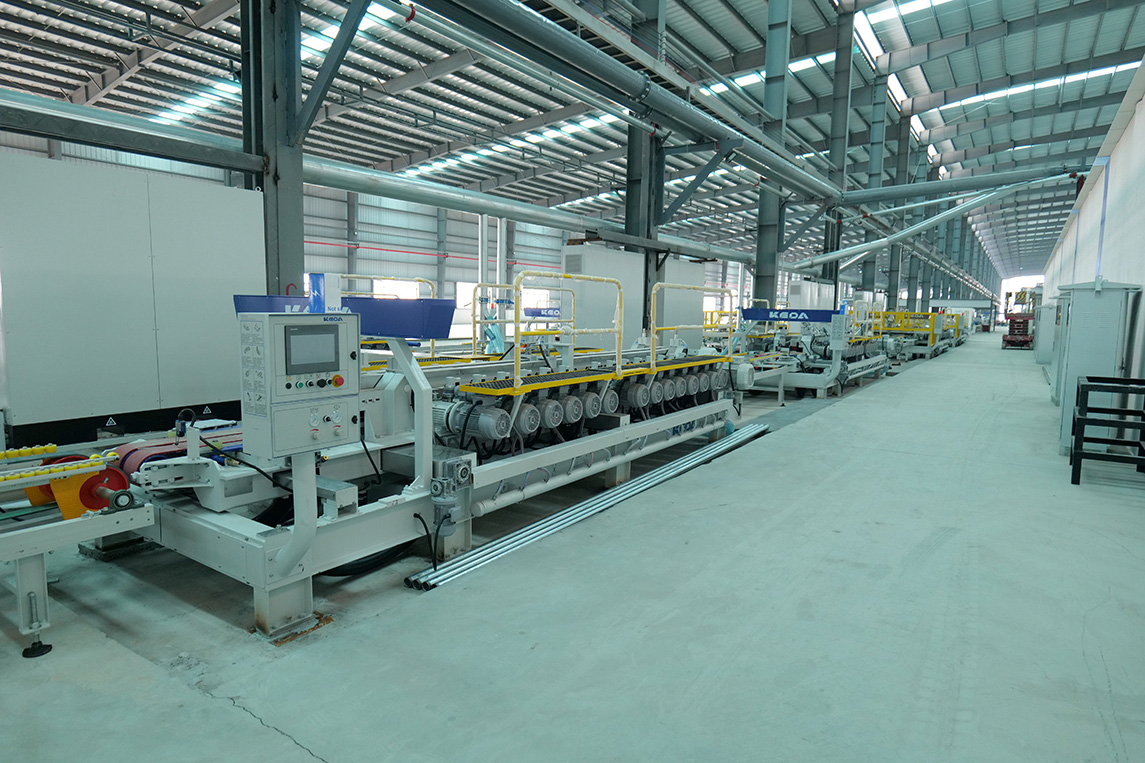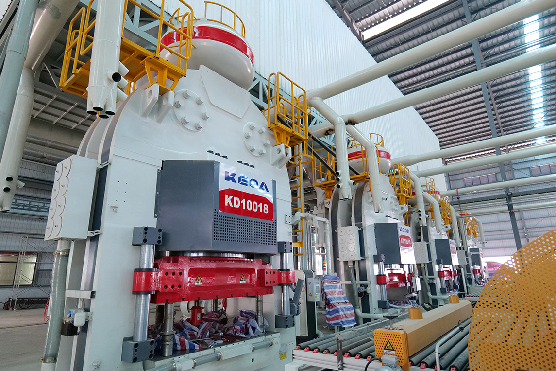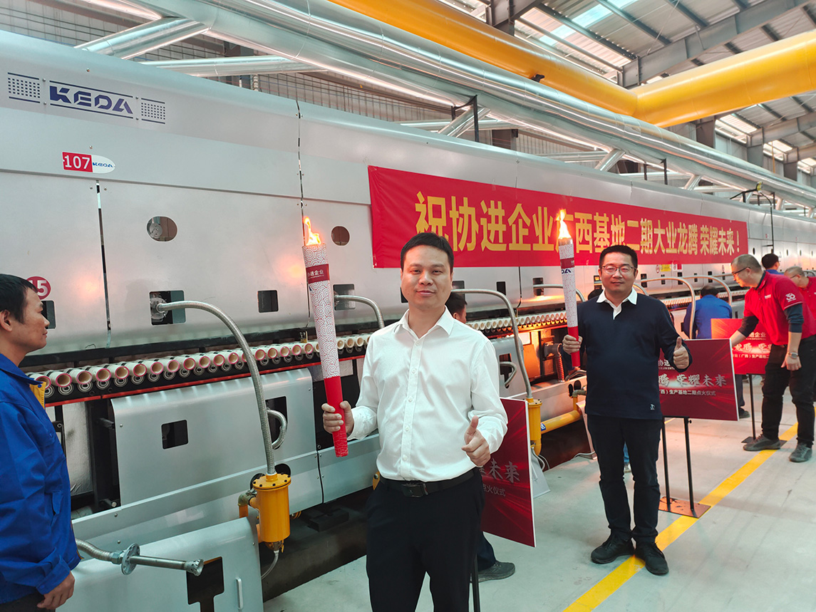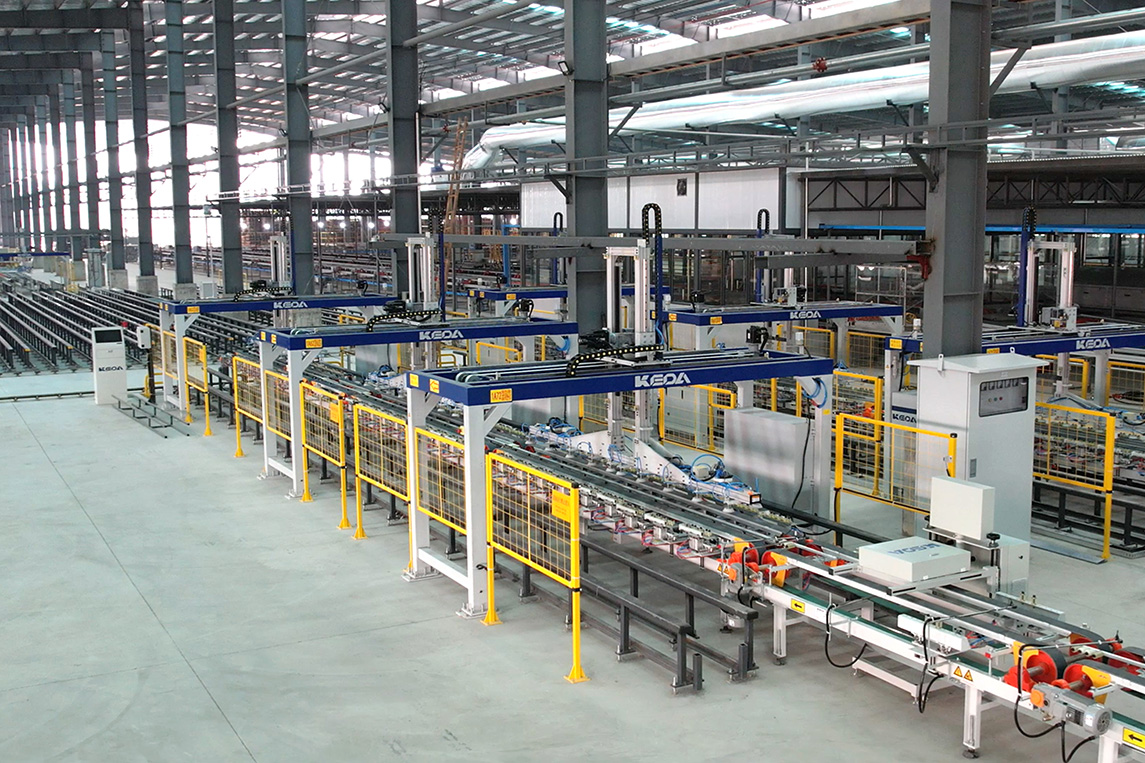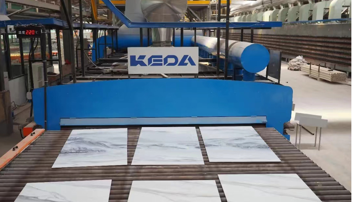 燒成設(shè)備為科達(dá)按高標(biāo)準(zhǔn)定制的高效節(jié)能寬體輥道窯,應(yīng)用了助燃風(fēng)加熱系統(tǒng)、助燃分組精準(zhǔn)控制系統(tǒng)、窯體綜合保溫升級系統(tǒng)、高效節(jié)能窯爐噴槍,以及V3.0窯爐智能控制系統(tǒng),為該線在產(chǎn)質(zhì)量、能耗及智能化等方面樹立領(lǐng)先優(yōu)勢提供充足保障。主要生產(chǎn)規(guī)格為400×800mm、800×800mm、 600×1200mm、750×1500mm等規(guī)格拋釉及中板產(chǎn)品,中板產(chǎn)品設(shè)計(jì)產(chǎn)能50000㎡/天。